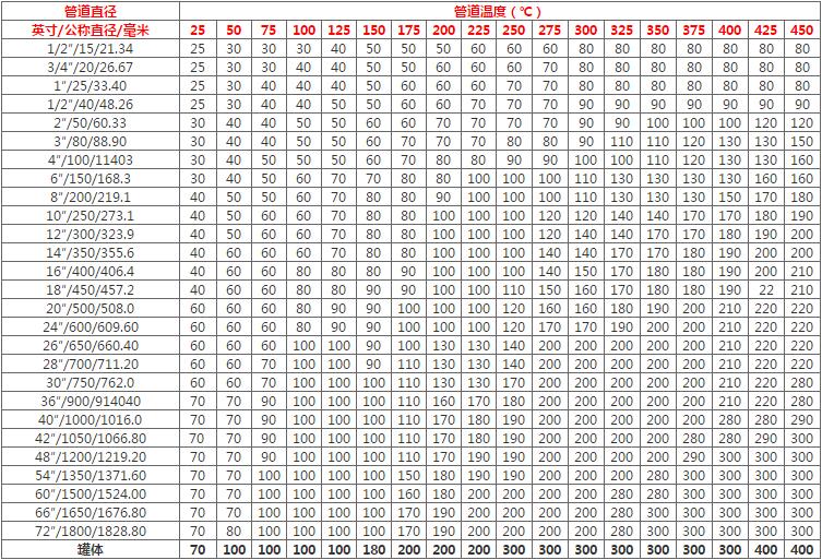 不(bu)同溫度(du)下,不(bu)同管徑的保(bao)溫材料(liao)厚度(du)不(bu)同。